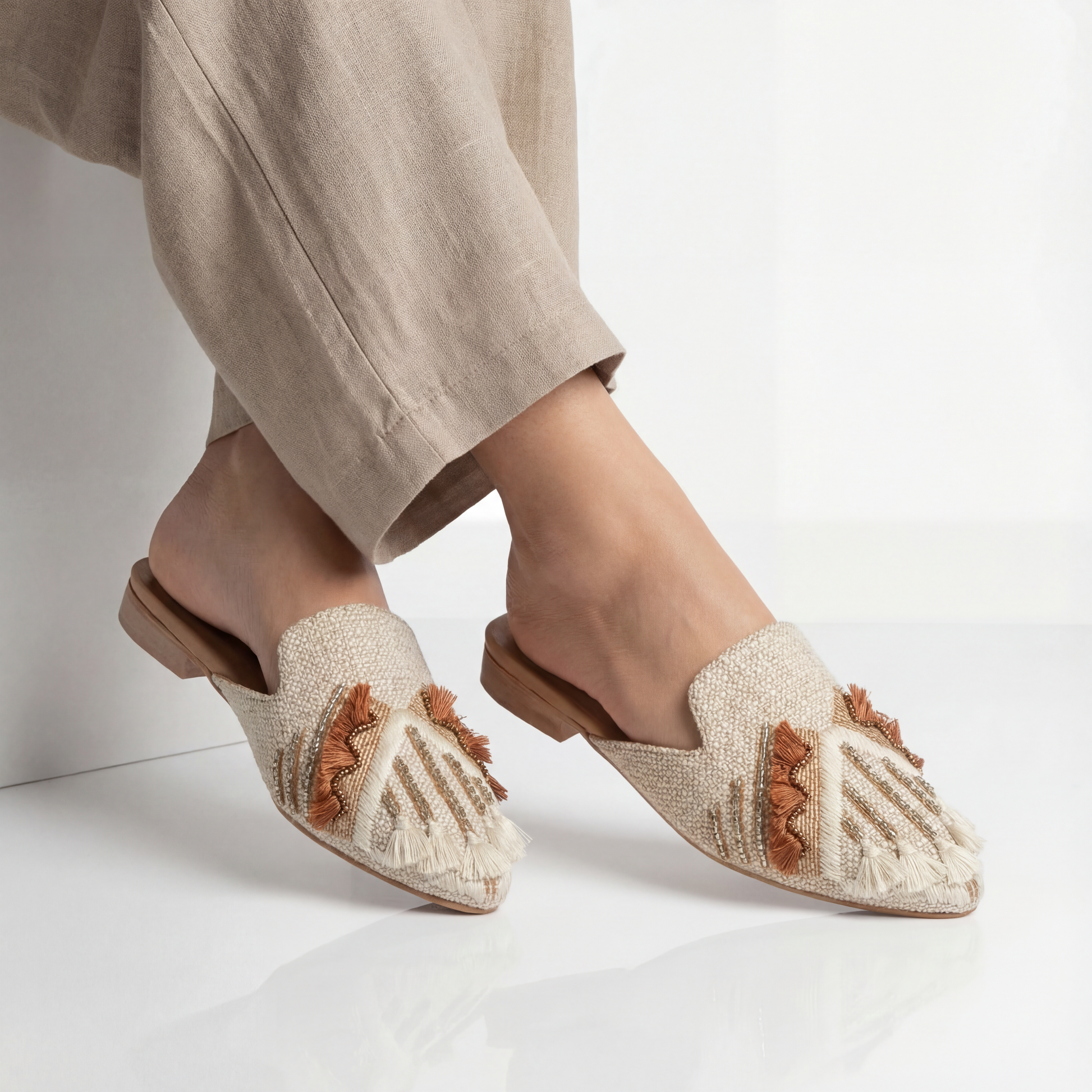 تألقي بإطلالة أنيقة ومريحة مع صندل نوماد داسك، حيث يلتقي التراث بالحرفية العصرية. مستوحى من ألوان الصحراء الهادئة، يتميز هذا الحذاء المفتوح بالتطريز الدقيق، والشراريب الفريدة، والخرز الفاخر، ليمنحك لمسة بوهو راقية.