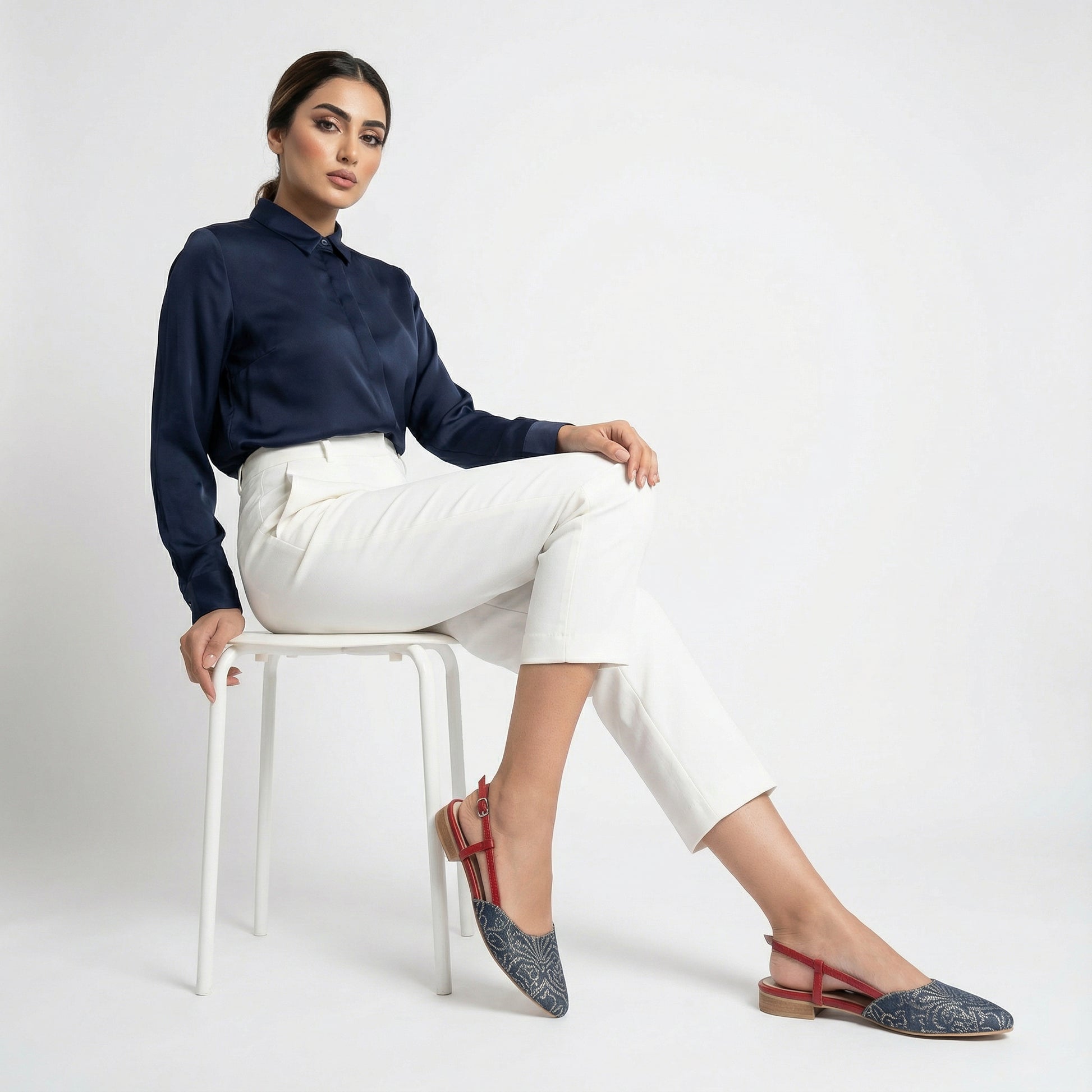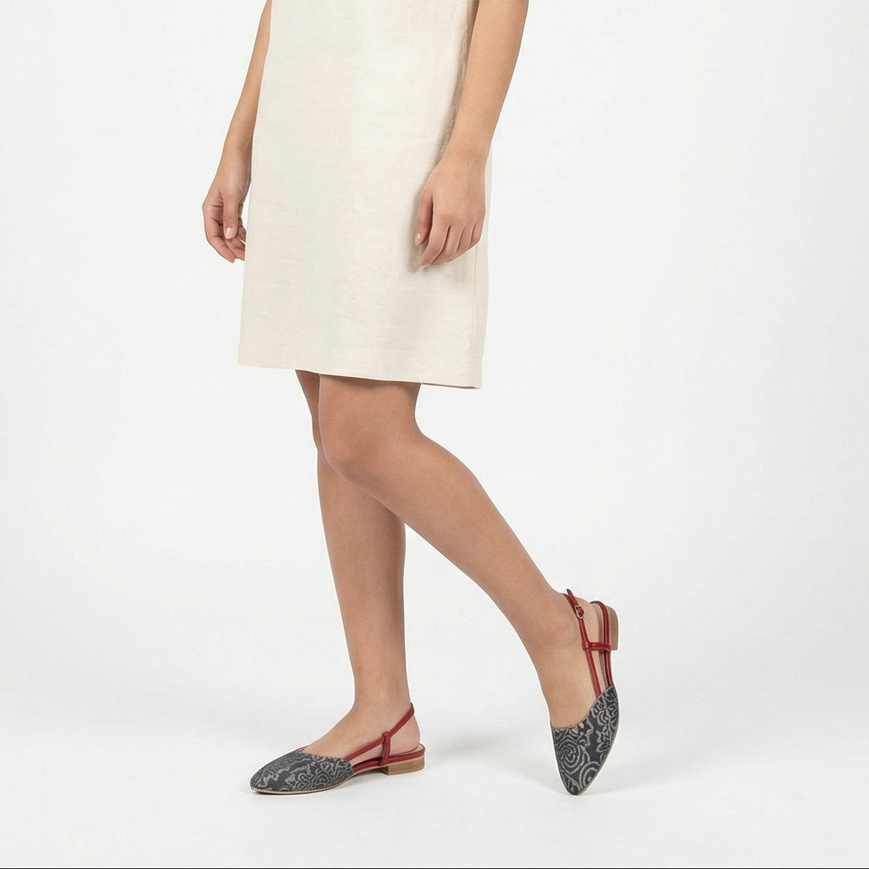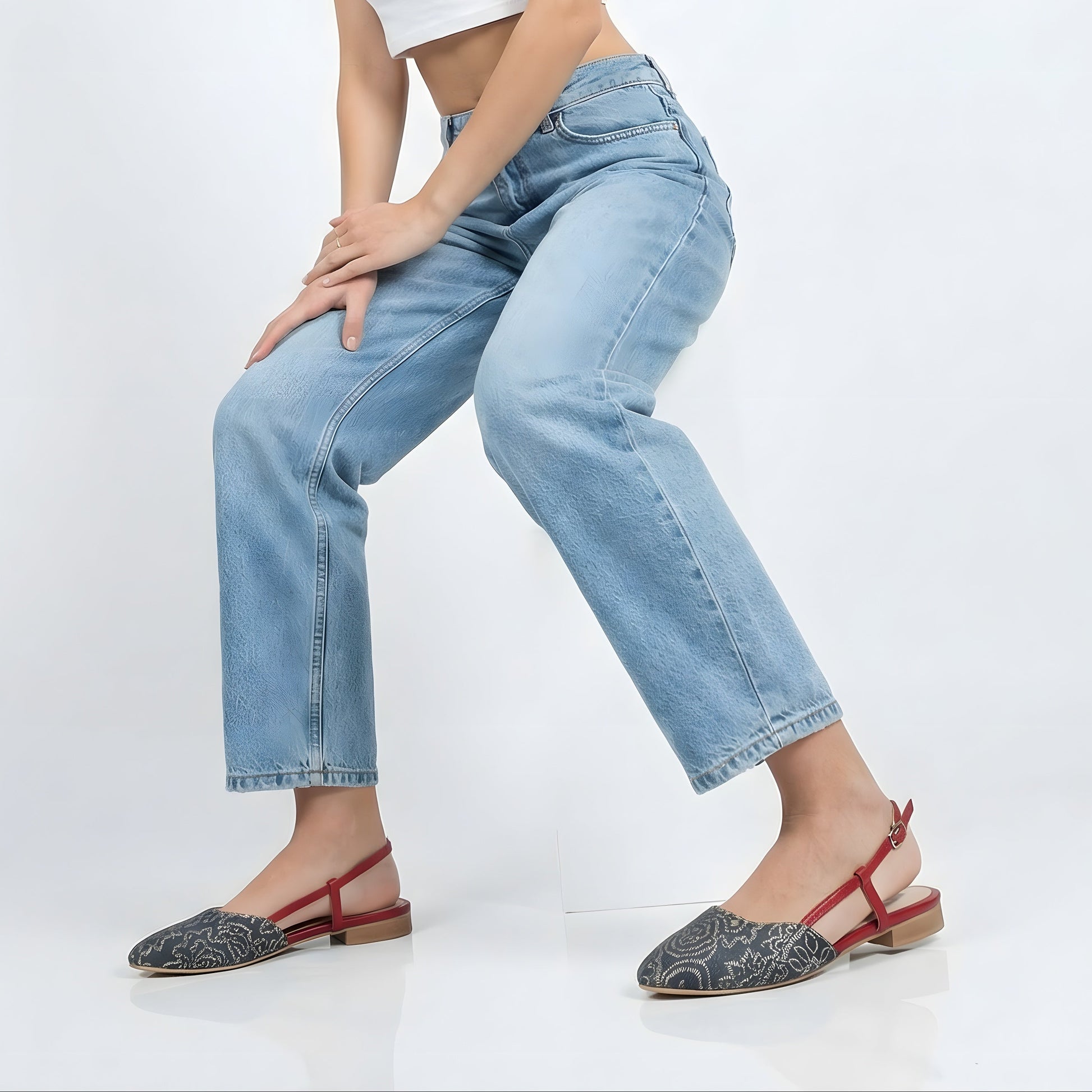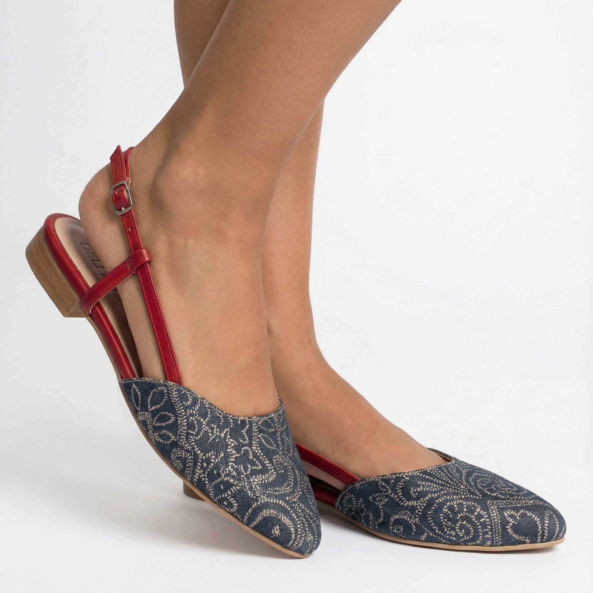اكتشفي روعة الأناقة الفنية مع حذاء Scarlet Ballet. تم تصميم هذه الأحذية العصرية من قماش فاخر يشبه الدنيم، مزين بتطريز بيزلي فضي أنيق، ومُزين بلمسات من الجلد الطبيعي الأحمر الغني. كل زوج هو تحفة فنية بفضل التصميم الداخلي والخارجي من الجلد الطبيعي لضمان راحة لا مثيل لها.