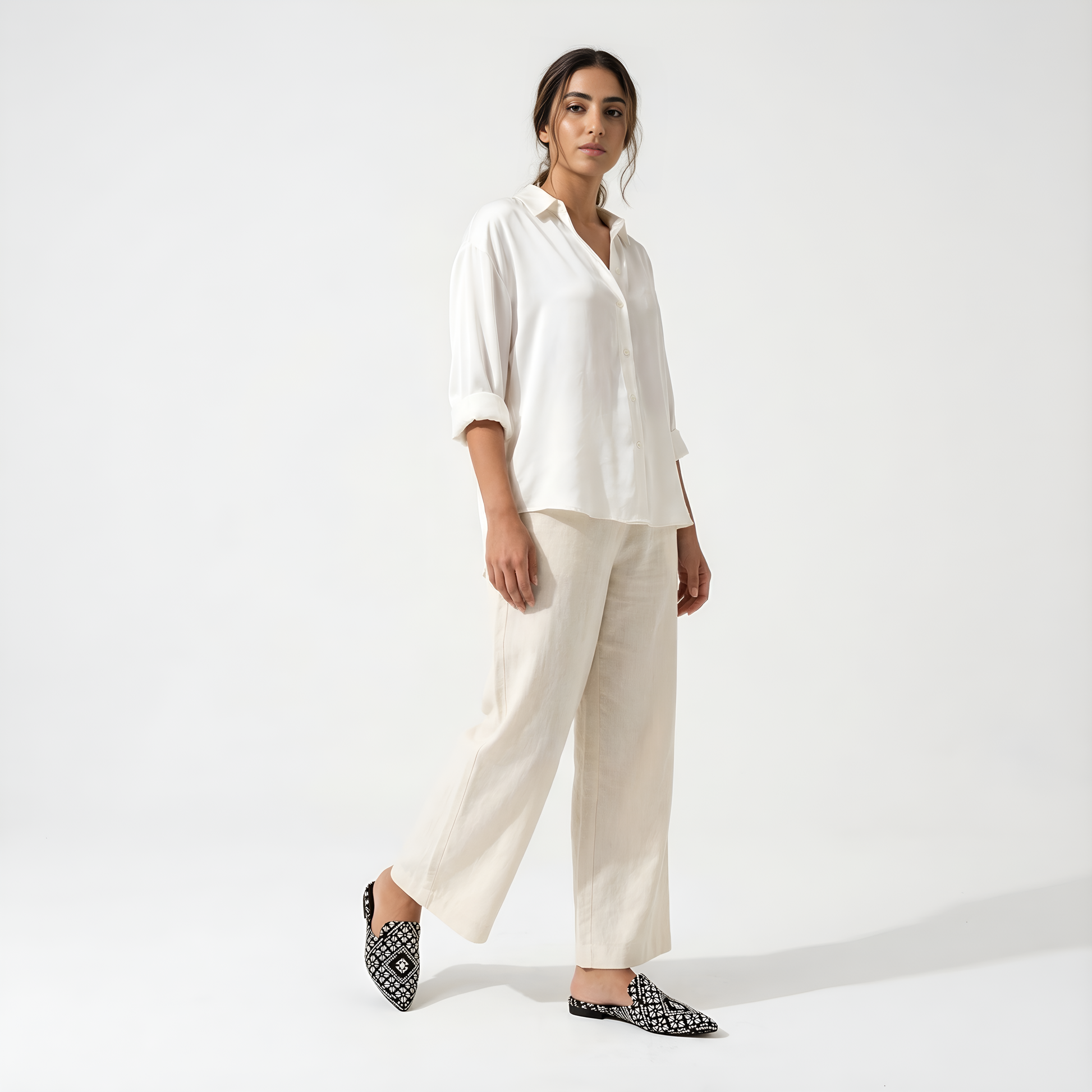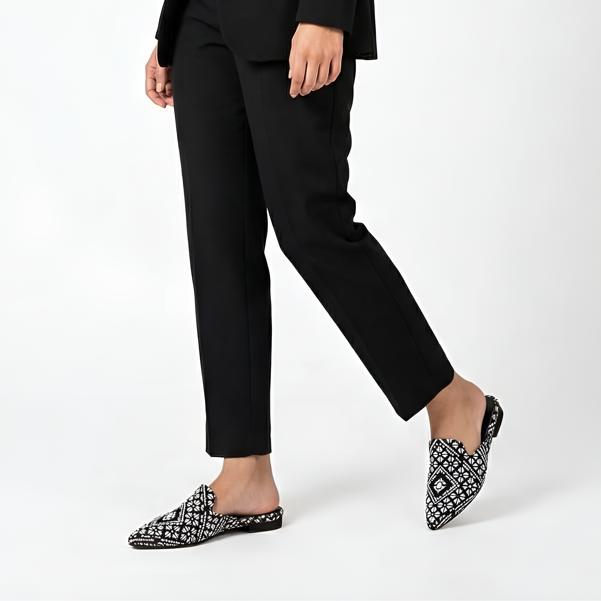 Crafted with precision, each pair features hand-stitched embroidery in a classic black-and-white palette, symbolizing the serenity of Middle Eastern Heritage. The pointed-toe silhouette offers a sleek, graceful touch, while the luxurious leather insole and cushioned footbed ensure all-day comfort.