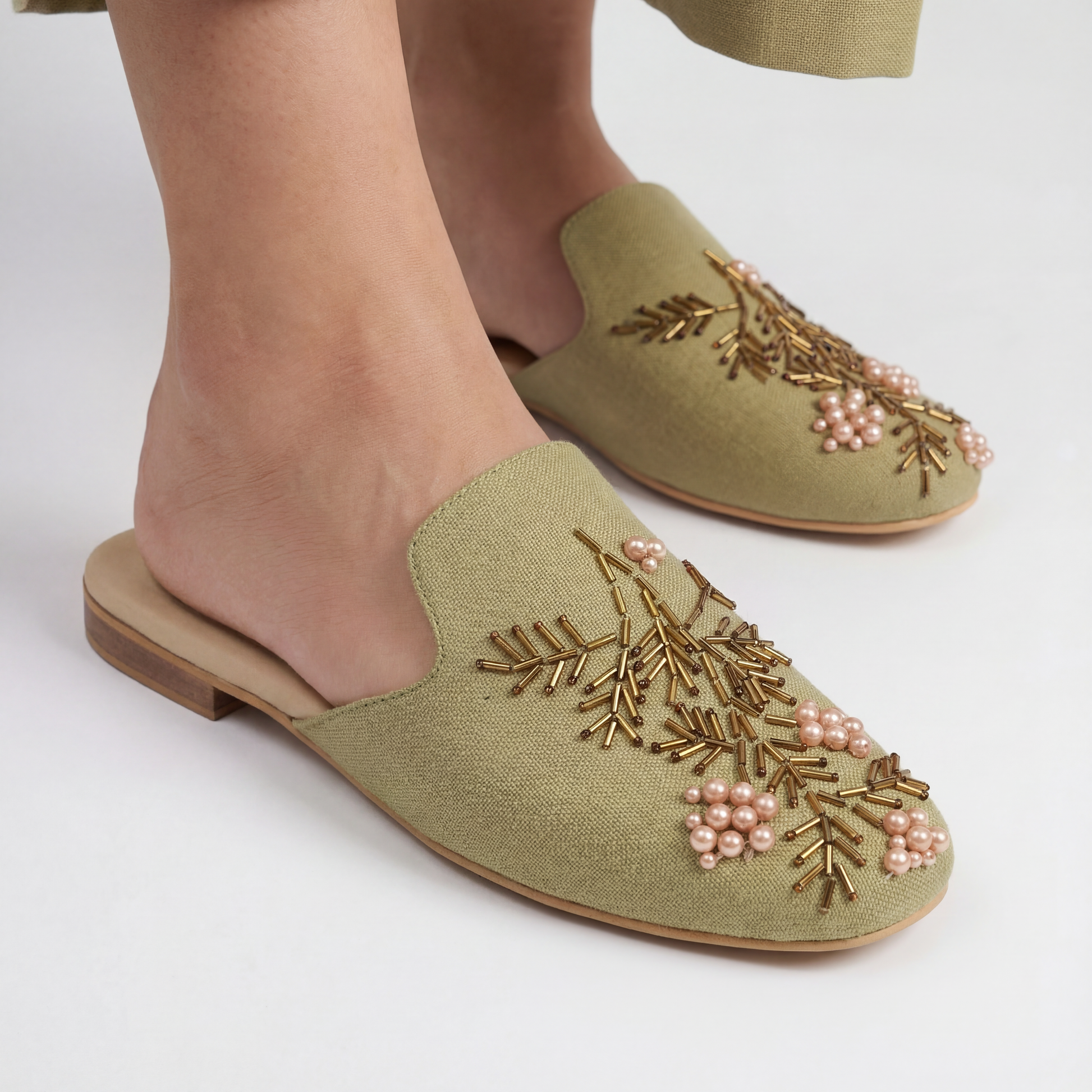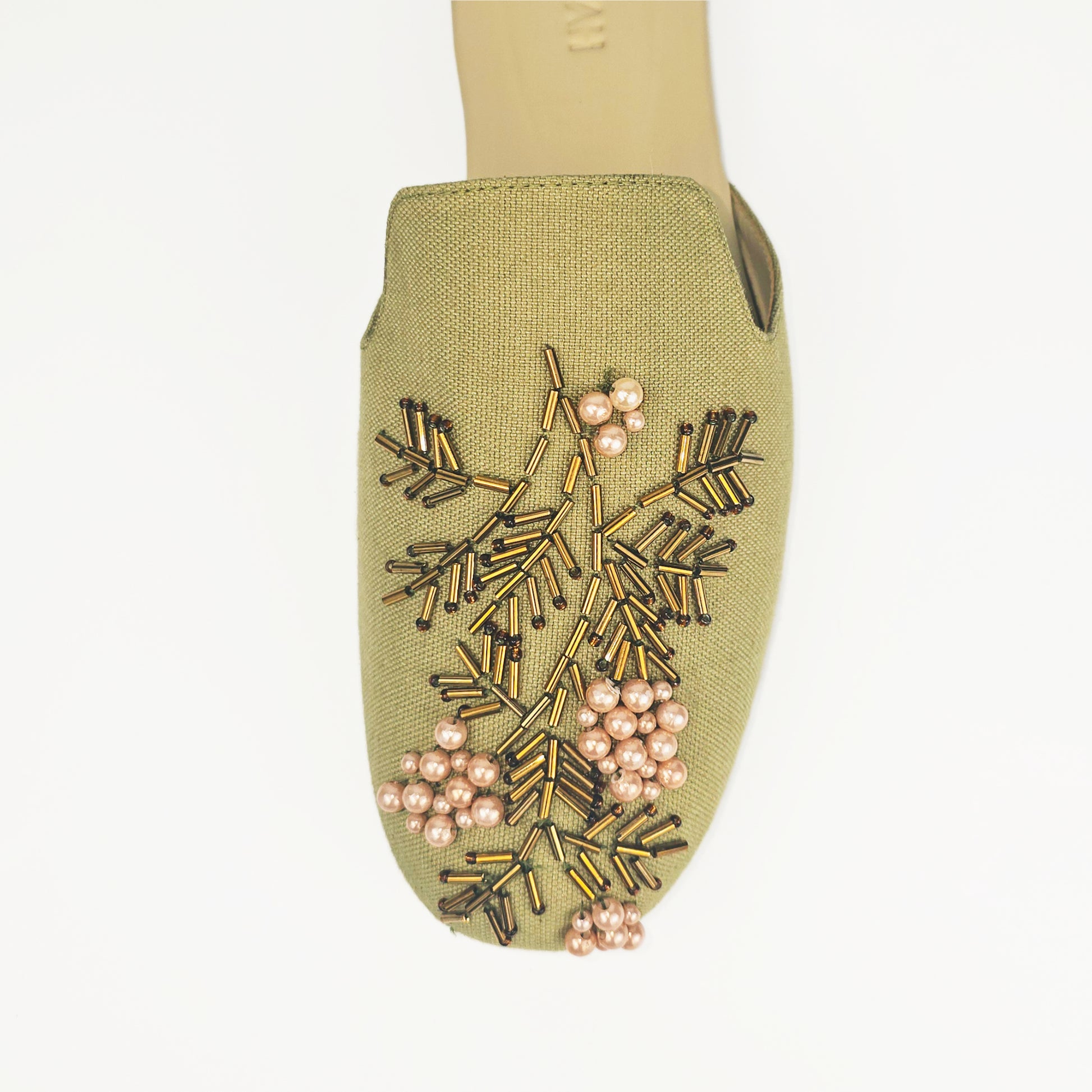 Step into elegance with the Sakura Blooms mules, a perfect blend of artisanal craftsmanship and modern sophistication. Inspired by the delicate beauty of cherry blossoms, these slip-on flats feature intricate hand-embellished floral beadwork, crafted with golden metallic threads and soft pink pearl accents. The natural fabric upper in a warm olive hue exudes understated luxury, making these mules a timeless addition to your wardrobe.