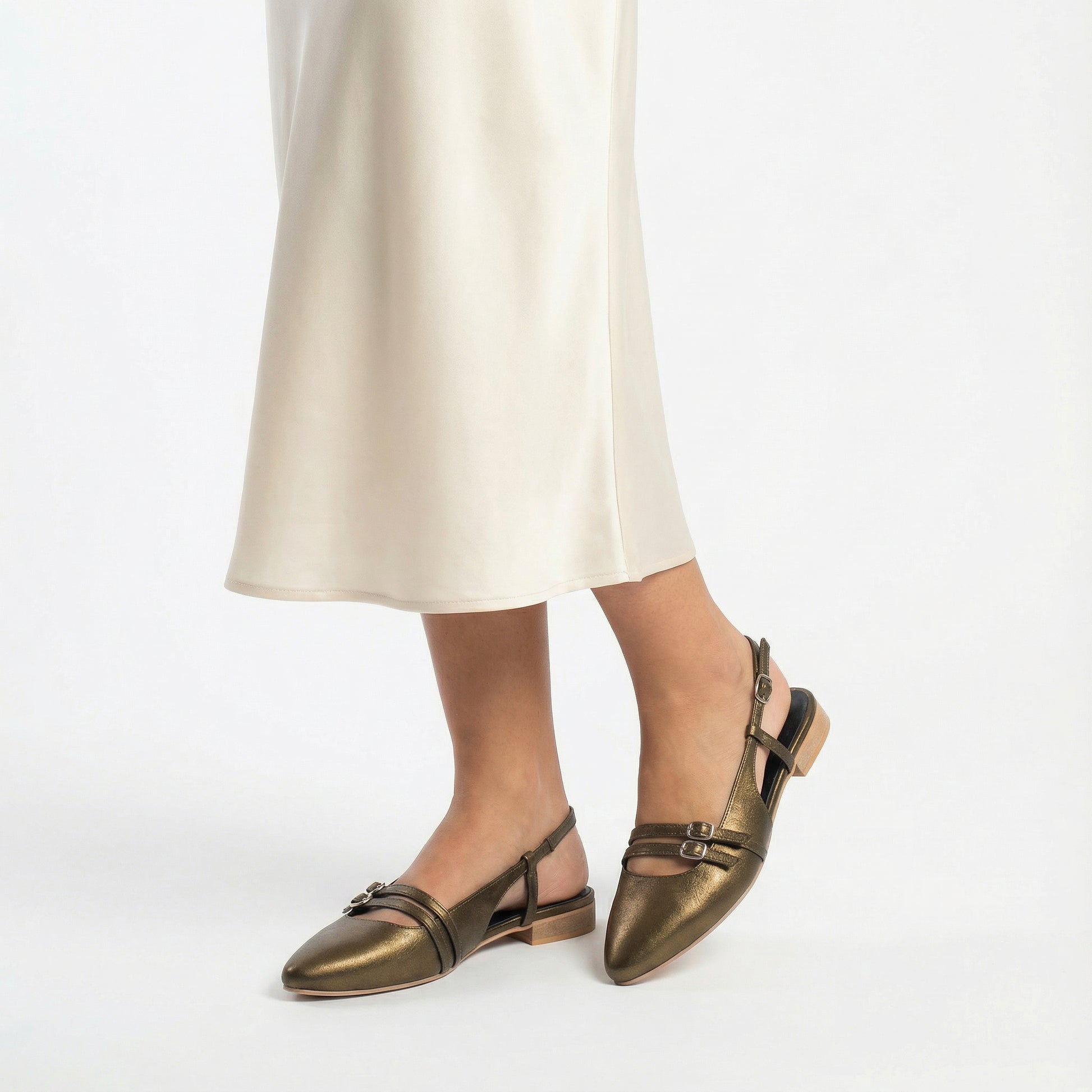 Step into radiance with Stardust, a statement of elegance from Delilah’s new metallic leather collection. Handcrafted from genuine natural leather with an iridescent finish, this slingback glows with every step. The vibrant gold hue is paired with a sleek pointed toe and delicate twin straps for a refined, modern silhouette.