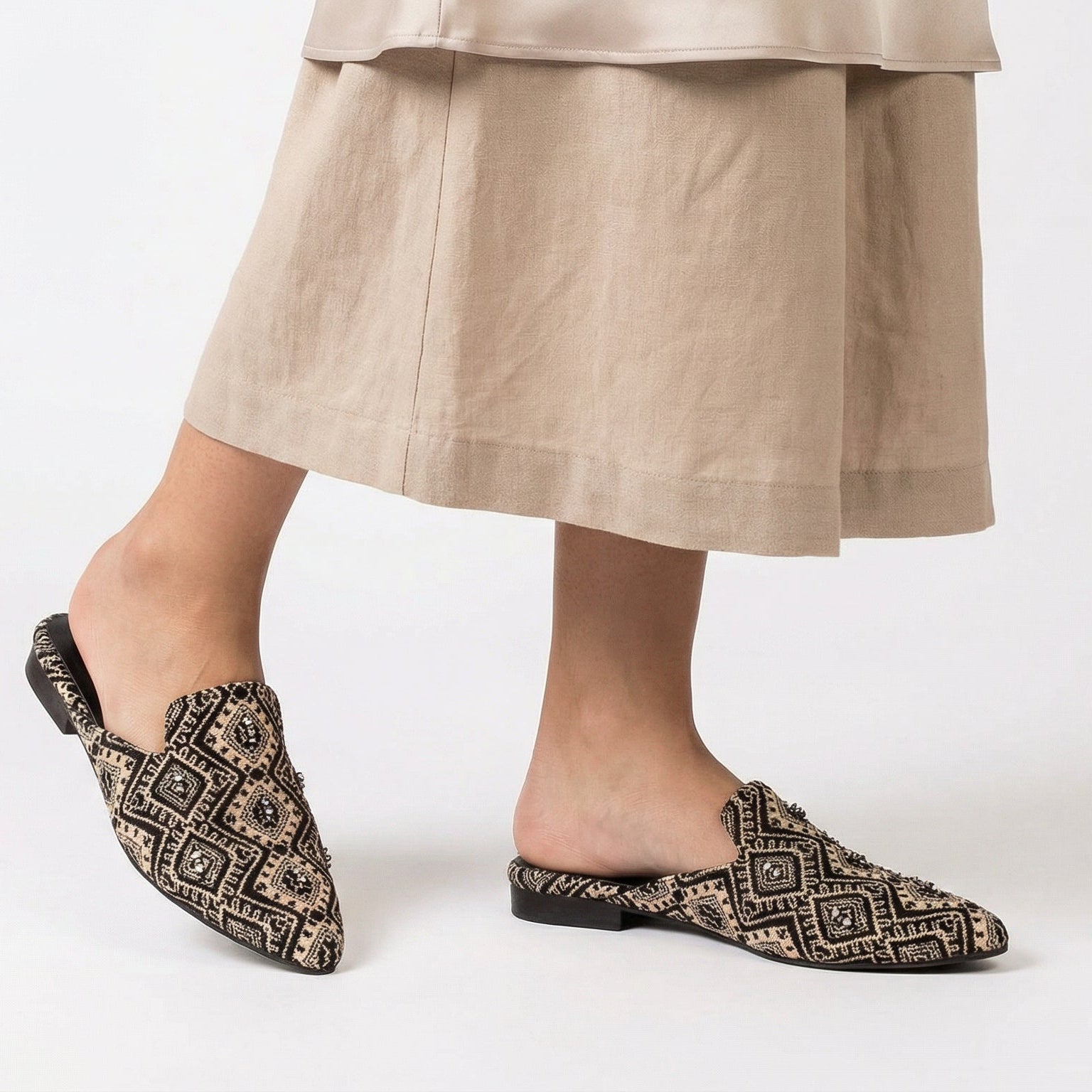 Step into timeless sophistication with the Tazeen Mules, a tribute to bohemian artistry and tribal patterns. Designed for the modern woman who embraces culture and style, these handcrafted slip-ons feature intricate embroidery with metallic accents, adding a refined touch to your wardrobe.